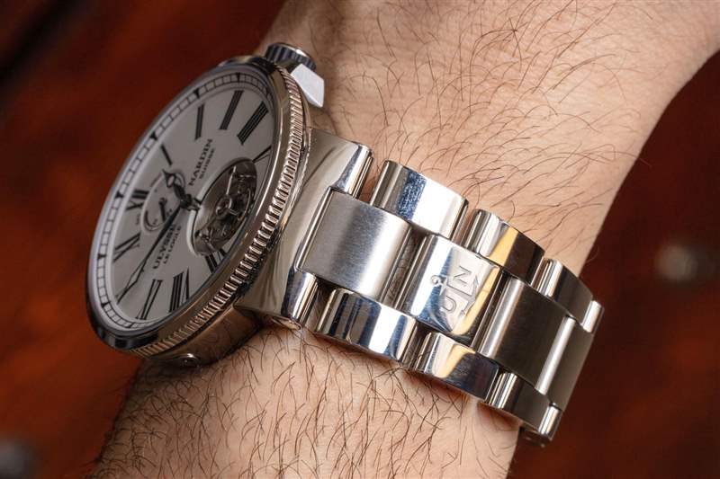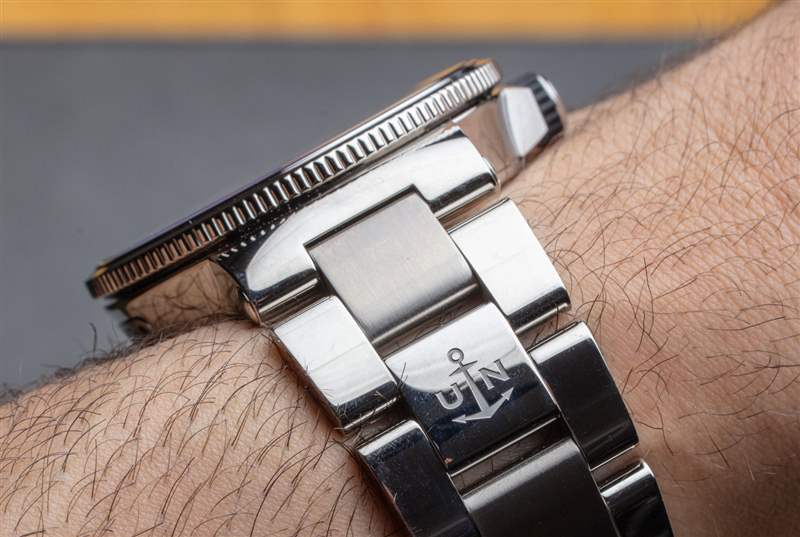 我更喜歡手鐲——主要是因為有人提供。三連桿精鋼表鏈設計簡單,結構上乘。它與表殼的形狀很好地融合在一起,并提供了非常舒適的佩戴體驗(盡管表帶選項也不錯)
