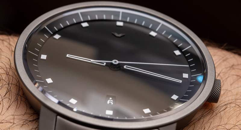 41mm 寬的碗形表殼,賞心悅目,優雅大方。表盤上方是一個圓頂藍寶石水晶 – 不幸的是,它上面有很多眩光。但由于面部的高對比度外觀,易讀性仍然很好。手表的各個角度似乎都經過了仔細考慮,我真的很喜歡表圈如何流入章環,章環流入表盤。表殼中等大小,整體感覺比例非常好。然而,這是一個簡單的表殼,只有 30 米的防水深度。手鐲很好,但不是最高科技的結構或部署結構。再說一次,它與文圖拉在 1990 年代生產的產品非常相似,盡管從那時起高端手表材料和結構已經走過了漫長的道路。應用,塊狀小時制造商與略帶錐形的鏤空指針一起工作,帶來可愛且視覺上有趣的計時體驗。日期窗口對稱放置在 6 點鐘位置,是為這款手表定制的(它不使用庫存的 ETA 日期輪)。廣告訊息廣告信息結束