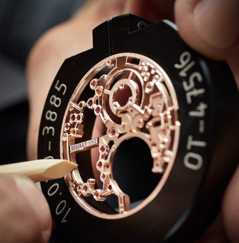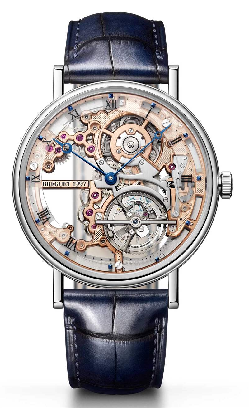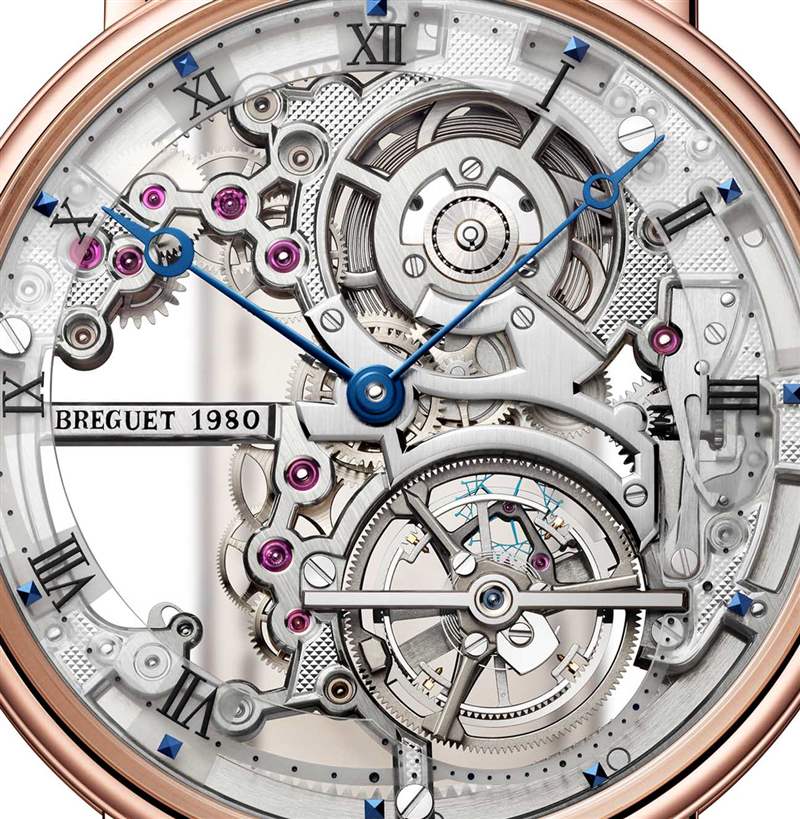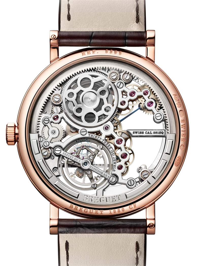 機芯 581(此處為 581SQ)的鏤空是一件藝術品,還需要巧妙地保留機芯架構的精致基礎設施。從鏤空主發條發條盒的有趣設計到一些外露橋板上的扭索雕花雕刻,這一切都展示了這件可愛藝術品的大部分表面上的極其細致的努力和工作。盡管經過大量的拋光、雕刻和塑造,Classique Tourbillon Extra-Plat Squelette 5395 仍然具有陽剛之氣以及熟悉的古典主義。