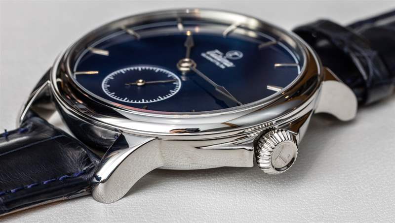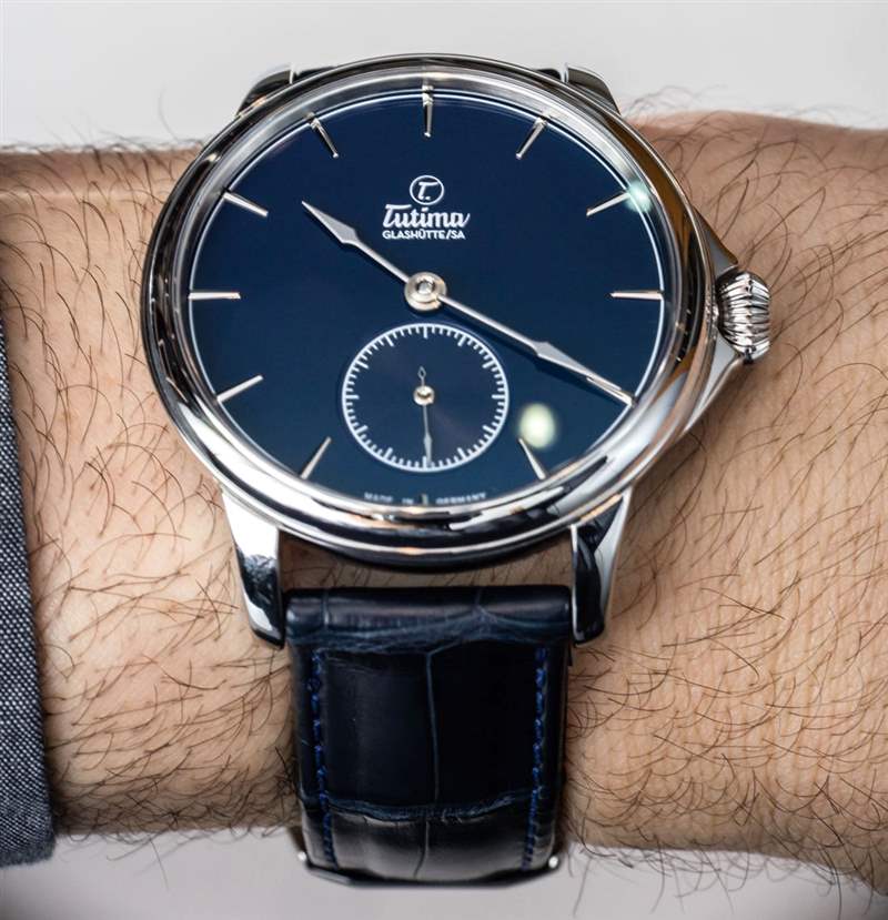 如今,正裝手表比運動手表更難銷售,主要是因為運動手表往往對許多奢侈手表購買者具有更多的日常吸引力。正裝手表更漂亮,但通常提供的佩戴機會較少,除非您經常穿著西裝或正裝。考慮到它的尺寸和它所提供的個性,像這樣的 43 毫米正裝手表可以兼作外觀優雅的“牛仔褲和 T 恤手表”。我覺得今天大多數比較成功的正裝手表都屬于這一類,因為它們對業主來說更加時尚百搭。價格也很重要;大多數人不認為 20,000 美元以上的金表適合休閑裝。將這個價格四分之一并提供鋼制表殼,現在你有了更多“日常吸引力”的東西。” 這就是為什么我認為 Tutima 應該能夠憑借 Patria Steel 如此成功,尤其是這款可愛的 Patria Admiral Blue 表款,搭配藍色鱷魚皮表帶和琺瑯表盤。