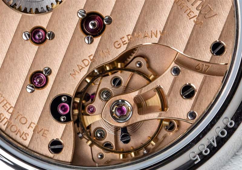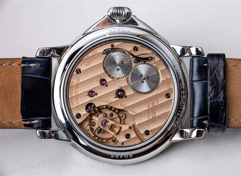 Tutima Patria 藍色海軍上將參考。6610-01(也有灰色或白色表盤版本的 Patria 鋼)基于 Patria 小秒針系列,該系列使用該品牌最簡單的手動上鏈計時機芯。Tutima 生產這種具有其他功能的更高級版本的機芯,例如動力儲存指示器和第二時區。也就是說,您可以使用 Patria 鋼獲得真正的高級鐘表,而海軍上將藍色表盤實際上是烤琺瑯。Calibre 617 機芯非常好看,采用典型的德國風格制造,帶有 3/4 夾板和用于固定紅寶石的金色套筒。該機芯還具有良好的手工加工水平,并且尺寸合適,因此通過手表上的藍寶石水晶底蓋可以看到表殼。機芯以 3Hz (21, 600 bph),動力儲存為 65 小時。手動上鏈機芯帶有輔助(小)秒盤顯示時間。廣告訊息廣告信息結束