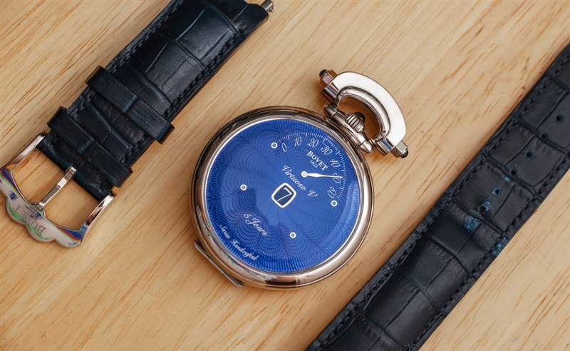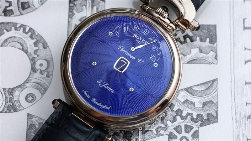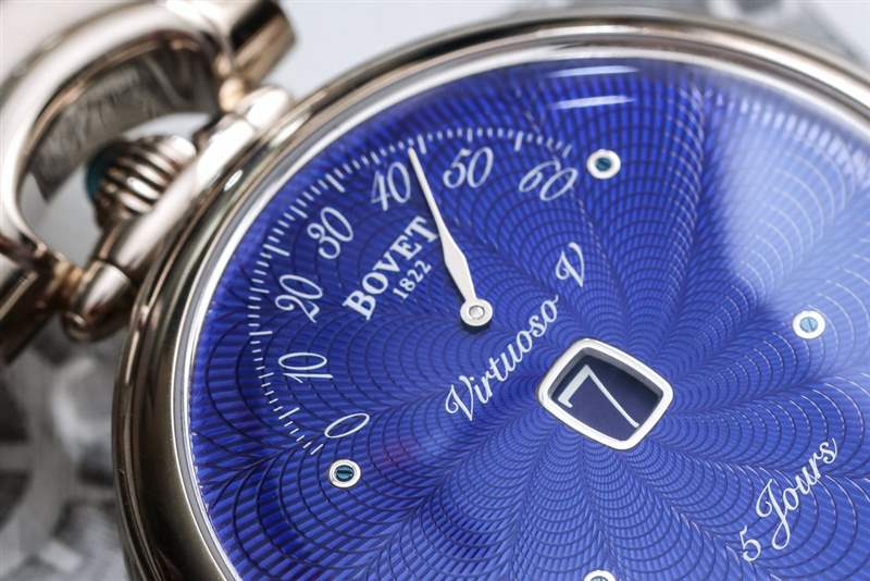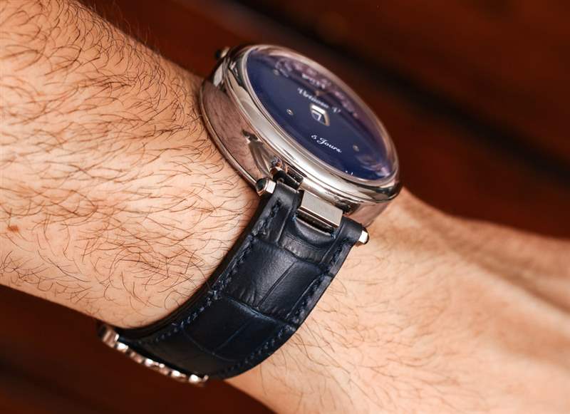 當(dāng)佩戴在手腕上時,Virtuoso V 的尺寸和重量都不是問題——盡管這不是一款特別小或特別輕的手表(里面有很多黃金?。?。藍(lán)色鱷魚皮表帶與表盤上的彩色“flinqué 琺瑯風(fēng)格”雕刻和上漆工作相得益彰——其中一個表盤幾乎完全雕刻和上漆在這款稀有版本的腕表上。這個版本的 Virtuoso V 在審查時甚至沒有出現(xiàn)在播威網(wǎng)站上——其他版本(不同的表殼材料和可選的鉆石)在表盤的跳時指示器側(cè)具有不同的外觀。