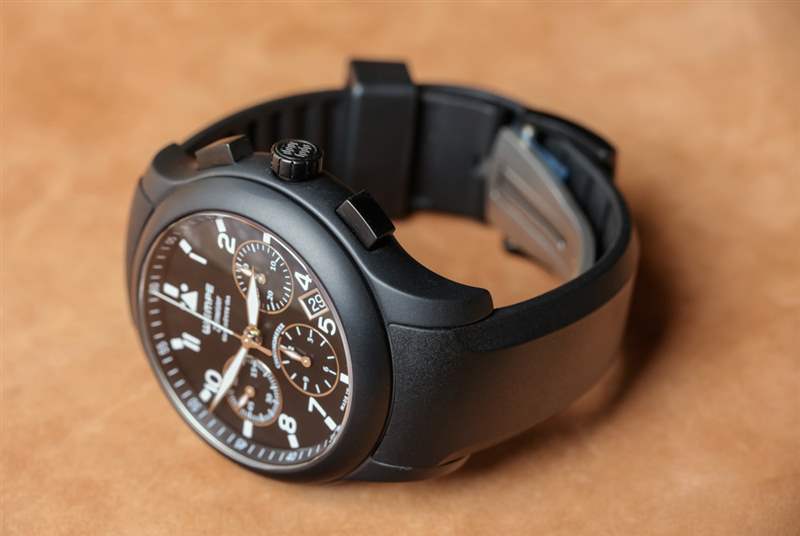 黑色陶瓷表殼有多大區別?首先讓我說,Zeitmeister Aviator Ceramic Chronograph reference WM60 0003 有一個姊妹型號,即參考 WM60 0004,采用鋼制。與陶瓷表殼的 44 毫米寬直徑相比,鋼殼型號在 42 毫米寬處也稍小一些。這些手表具有相同的表盤和機芯,不過鋼制 Zeitmeister Aviator Chronograph 配備鱷魚皮表帶,而這款陶瓷表款配備運動型表殼黑色橡膠表帶和折疊鋼展開裝置。那么陶瓷有多大的不同呢?我覺得我有點。精鋼表款具有非常傳統但柔軟的手感(得益于圓形表殼),