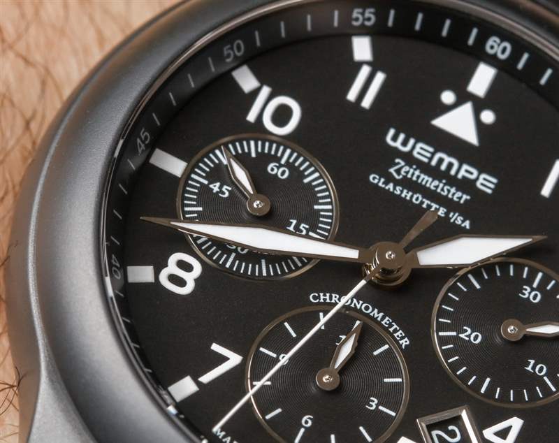 有時佩戴 Zeitmeister Aviator Ceramic Chronograph,我不確定表殼和表盤的設計元素是和諧地協同工作還是相互沖突。減去飛行員手表風格的表盤,表殼簡單、簡約、柔和、微妙(由于物質整理)和現代感。然而,表盤是對過去的證明,其經常使用的飛行員式 12 點鐘小時指示器、易于閱讀的阿拉伯小時數字和清晰的計時小表盤。Wempe 竭盡全力在表盤上保持“工具表美學”,但也增加了一點天賦。您只能在手表的少數區域看到后者,例如略微凹陷的計時碼表子表盤周圍的拋光指針和拋光環。