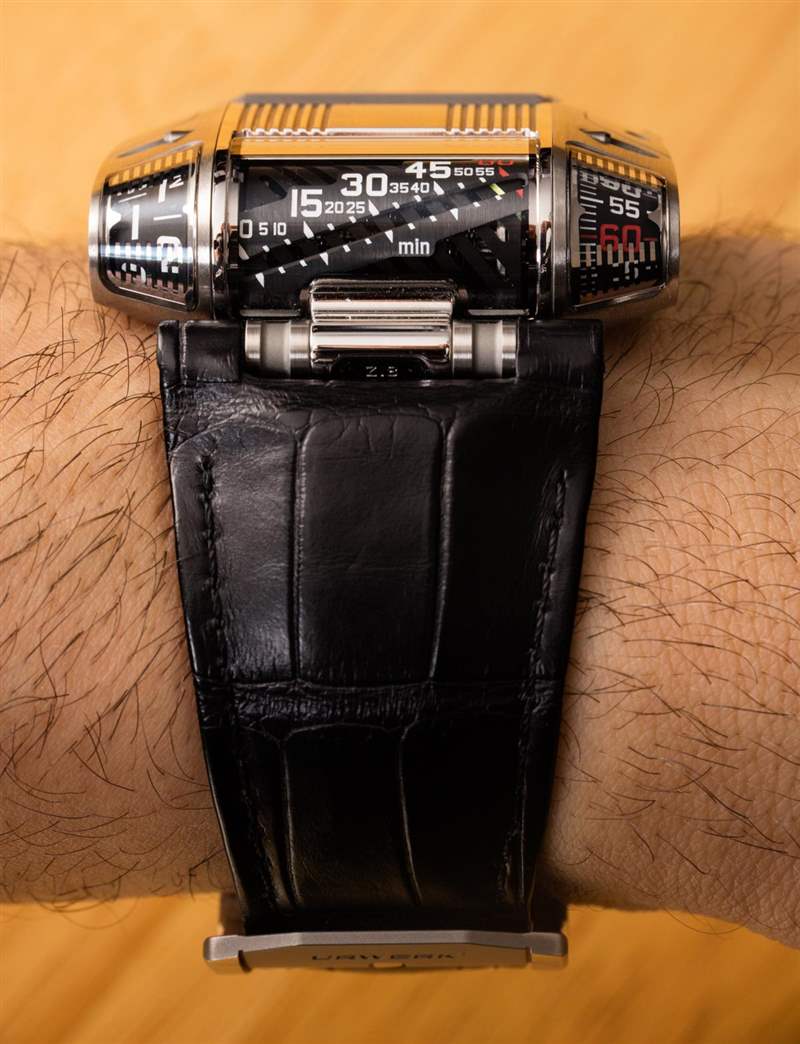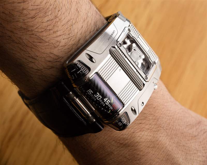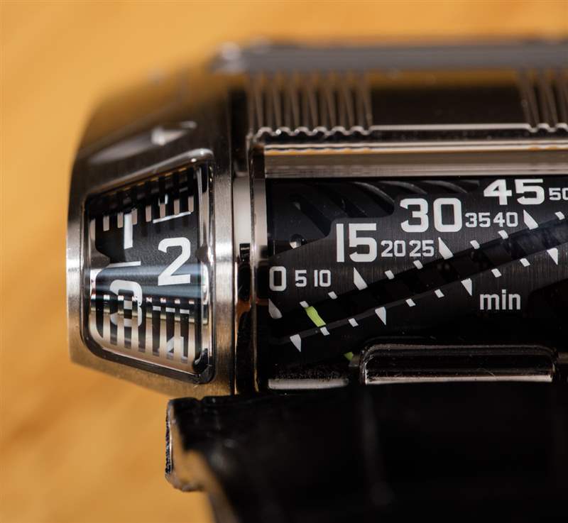 我對手表的另一個抱怨是易讀性。在我看來,根本沒有足夠強調指示小時,而在左側指示小時和在右側指示分鐘(再次)的側窗使用藍寶石水晶內部的薄金屬片應用來創建表盤/標記的外觀。這些元素反射過多的光線,使您的眼睛很難看清需要去哪里。你可能會習慣它,但我認為這個細節可以在未來版本的手表中使用更好的改進。分鐘顯示兩次。首先使用表殼中央的線性指示器,然后再次使用手表右側的轉動鼓式指示器。我以前以為手表沒有發光體,然后我意識到我忽略了這只手表確實有流明數字和標記。這包括正面指示器以及外殼頂部安裝的秒指示器。發光體的印刷非常淺,因此需要大量光線才能充電,但一旦全部點亮,UR-111C 在黑暗中看起來真的很酷。