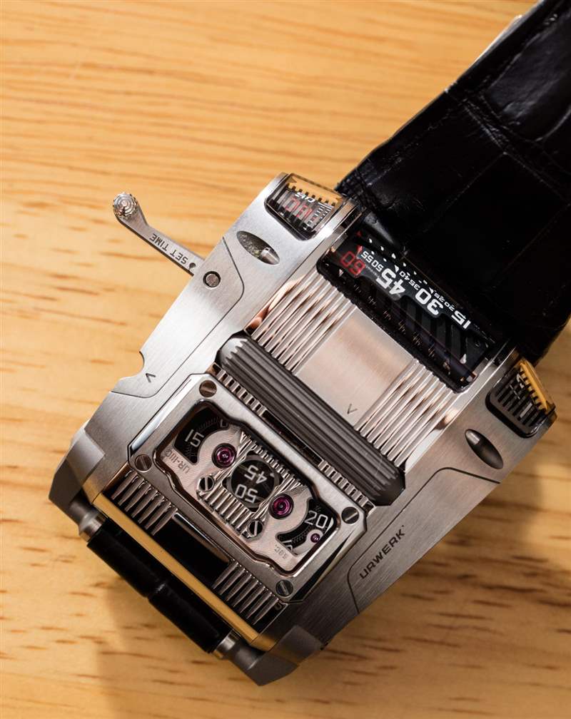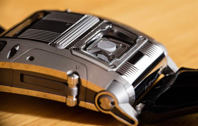 在典型的 Urwerk 時尚中,表殼的貼合度和表面處理非常出色。除了看起來不錯外,外殼部件還具有出色的公差,并且都非常適合。考慮到一切都需要定制,以及 UR-111C 表殼和機芯使用的各種形狀、飾面和材料,這令人印象深刻。然而,后凸耳結構并沒有清晰表達——盡管它看起來好像是有意的。以這個價格和這種設計,我希望看到一些凸耳鉸接動作。