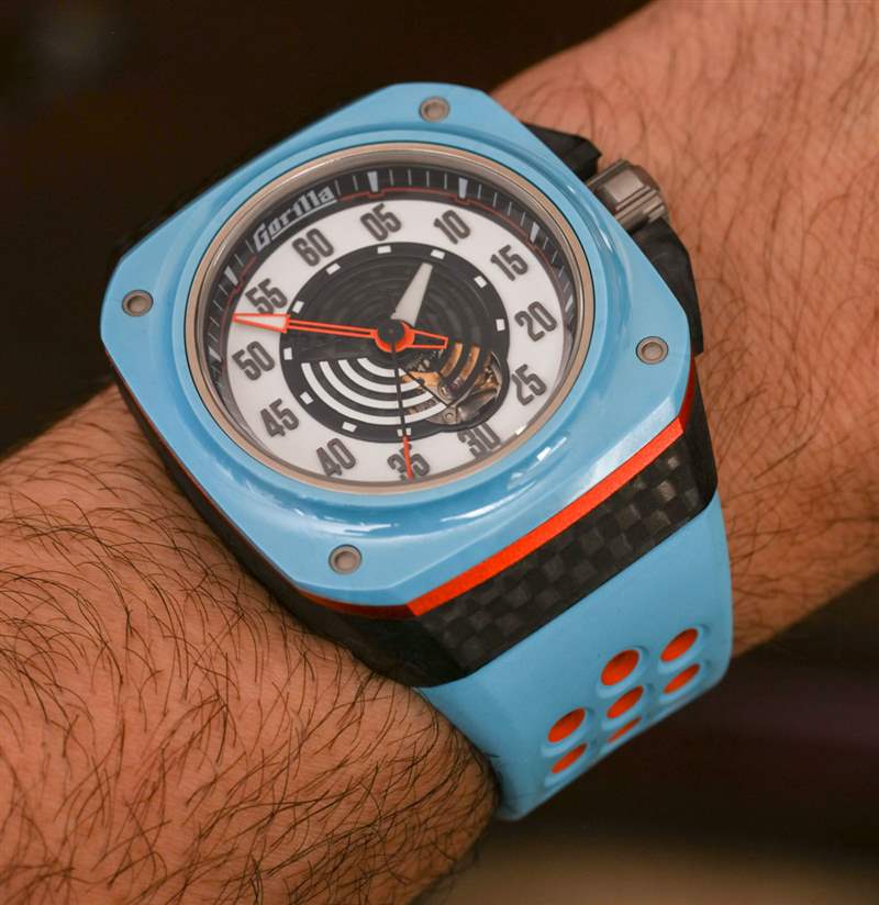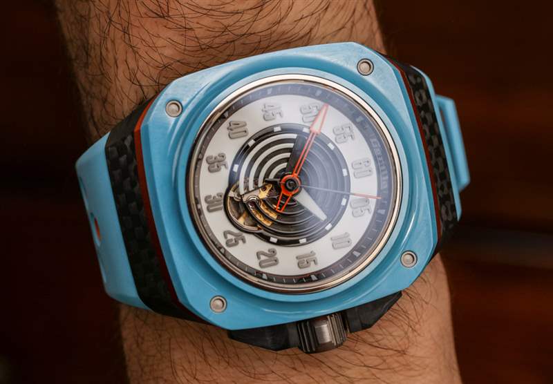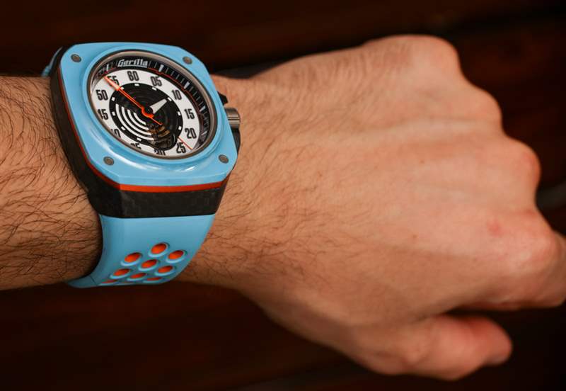 Fastback GT Mirage 表殼呈方形,寬 44 毫米(表冠寬 48.5 毫米),防水深度達(dá) 100 米。由于表殼形狀和寬肩帶,它穿得很大——但這就是 Gorilla 想要的外觀。我會(huì)爭(zhēng)辯說,盡管尺寸很大,但手表佩戴起來很舒服。對(duì)于 Mirage 版本的手表,Gorilla 繼續(xù)采用鍛造碳表殼,在此型號(hào)上,表耳結(jié)構(gòu)附近有一些碳纖維紋理(一個(gè)容易錯(cuò)過的細(xì)節(jié))。該表殼還使用鋼、鈦、陽極氧化鋁作為表圈下方的橙色環(huán),以及用于表圈本身的陶瓷。這是我見過的少數(shù)幾款使用“粉藍(lán)色”陶瓷部件的手表之一——如今這仍然不常見。表盤上方是 AR 涂層藍(lán)寶石水晶。廣告訊息廣告信息結(jié)束