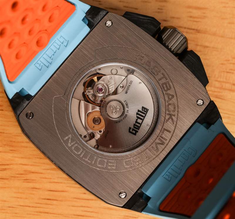 對(duì)于 Fastback GT Mirage,Gorilla 做了一些不同的事情,除了改變現(xiàn)有 Fackback 系列的顏色(沒有“GT”)。與 Fastback 相比,這款 Fastback GT Mirage 的主要區(qū)別在于升級(jí)的機(jī)芯(除了顏色)。Miyota 不再是 8XXX 系列日本 Miyota 機(jī)芯,而是來自 Miyota 9XXX 系列,在這種情況下是 Miyota 90S5 機(jī)芯。這款自動(dòng)機(jī)芯以 4 赫茲的頻率運(yùn)行,具有 48 小時(shí)的動(dòng)力儲(chǔ)存,并且通過手表的表盤可以看到外露的擒縱機(jī)構(gòu)。90S5在性能和外觀上都是升級(jí)版。您可以通過表殼背面的水晶窗看到機(jī)芯的其余部分。