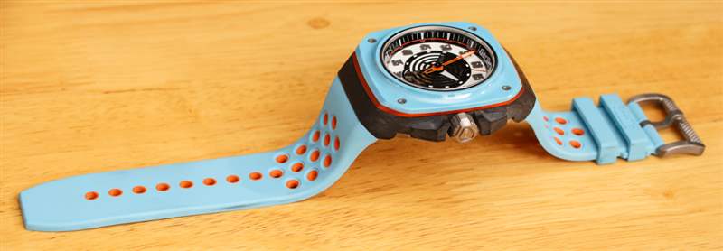 海灣石油/賽車藍(lán)和橙色主題的大部分體現(xiàn)在雙色橡膠表帶上,表帶外側(cè)為藍(lán)色,內(nèi)側(cè)為橙色。橙色可以通過表帶上的穿孔識(shí)別出來,我認(rèn)為大猩猩在設(shè)計(jì)如何使用顏色方面做得很好。連接到表帶的是一個(gè)鈦扣。