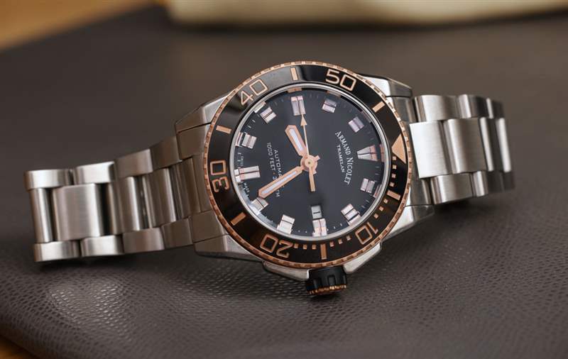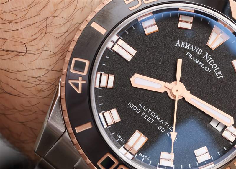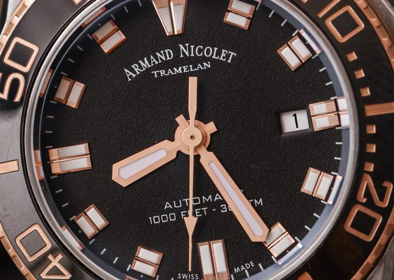 除了金屬手鏈之外,我還想要一條橡膠表帶,這實際上是一件好事。Armand Nicolet 設法制造出一款新的潛水表,它不會立即讓人感覺像其他品牌的潛水表,同時它也設法讓人感覺現代和陽剛。不,該設計并不適合所有人,但每當我看到有人嘗試新事物時,我都會非常高興。Armand Nicolet 的靈感當然來自以宇舶 Big Bang 為代表的手表設計風格(大膽、工業、男子氣概的風格,混合了許多顏色和材料)。同時你會感覺到這款手表可以用作工具表。我最喜歡這款黑色和玫瑰金色 JS9 版本的功能之一是時針、分針和秒針的啞光處理。