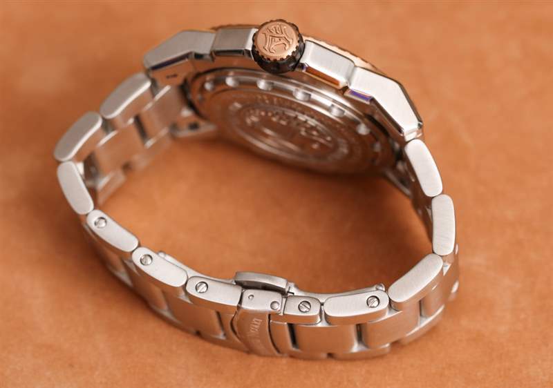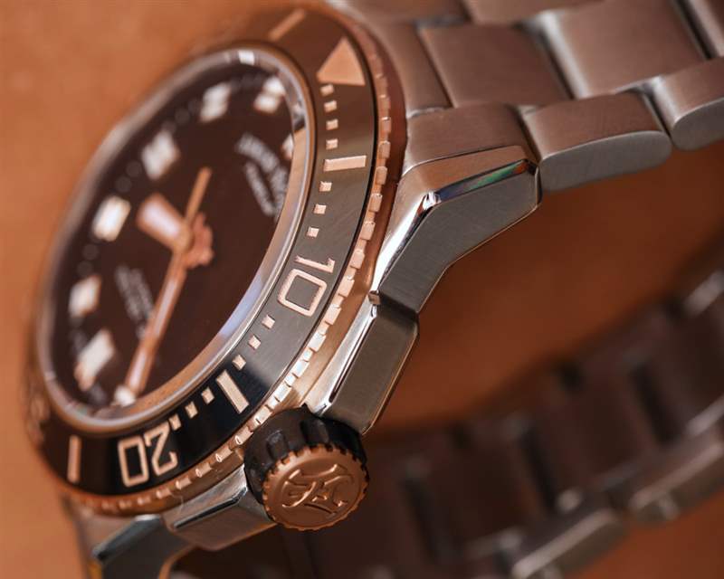 表盤周圍是我上面提到的傾斜旋轉潛水表圈。表圈嵌件材料采用拋光黑色陶瓷,表圈上的機切數字根據JS9的版本涂有不同的顏色。除了這種玫瑰金色油漆外,其他版本還使用了白色/銀色。JS9 的表盤顏色目前為白色、黑色和藍色。Armand Nicolet 似乎真的很喜歡玫瑰金外觀,因為 2018 年可用的 JS9 型號中有一半以上采用這種顏色。一些最有趣的與審查版本相似,但帶有白色表盤。“經典” JS9 潛水表型號可能是帶有銀色/白色文字/標記和藍色或黑色表盤的型號。
