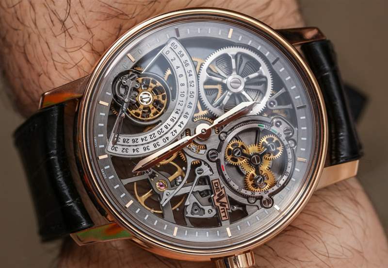 盡管始終具有明顯的技術(shù)優(yōu)勢,但許多 DeWitt 手表經(jīng)常存在一個或多個小的易讀性問題。在 Academia Skeleton 的情況下,指針很容易融入表盤,而且有點偏短。雙手遭受完全拋光以及自身有點骨架化的困擾。這不可避免地導(dǎo)致與設(shè)計師的分歧,即他們“想要這樣”。這是否意味著他們不希望手被強(qiáng)調(diào)?我認(rèn)為確實如此。我完全不同意豪華手表不需要專注于清晰地顯示時間的設(shè)計理念,因為人們購買這些產(chǎn)品是為了藝術(shù)目的。我提到這個反駁我的論點,因為這是我在與許多品牌私下討論與易讀性相關(guān)的問題時得到的典型回應(yīng)。他們一次又一次不同意我的觀點,而明確的證據(jù)表明清晰的手表是市場上銷售最廣泛的手表。再說一次,由于 DeWitt 的產(chǎn)量很低,我認(rèn)為他們在銷售 28 塊 Academia Skeleton 手表時應(yīng)該不會有太多麻煩。