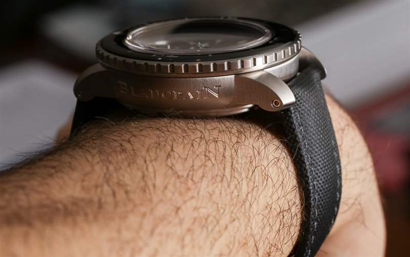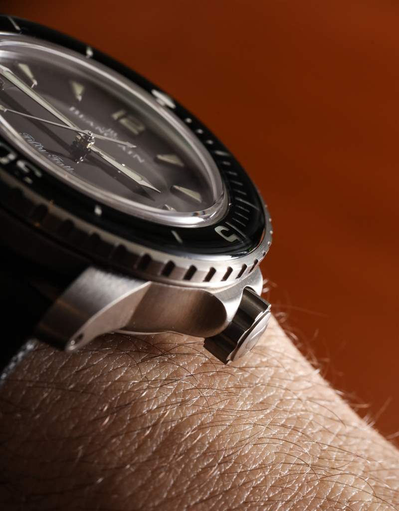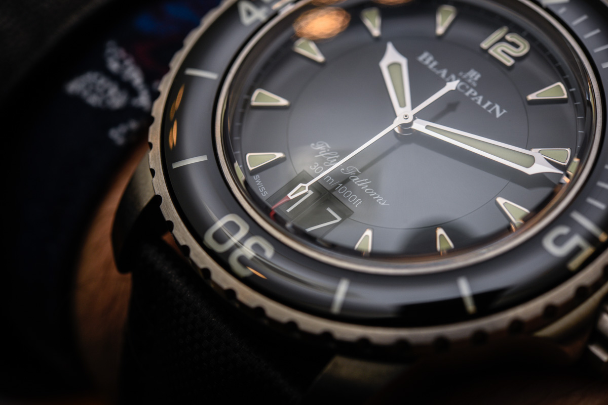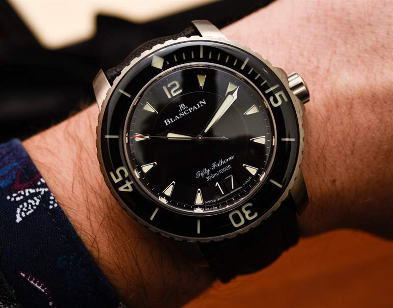 確實(shí),不再生產(chǎn)的寶珀 500 噚潛水表是該品牌現(xiàn)代潛水表型號中第一款使用鈦金屬的。該型號更大,寬 48 毫米(厚約 17 毫米),相比之下,已經(jīng)很大的 45 毫米寬(和 16.27 毫米厚)五十噚在尺寸上顯得適中。與五十噚精鋼的精致拋光處理不同,這款鈦金屬 5050 型號對鈦金屬進(jìn)行了更具工具風(fēng)格的緞面拉絲處理。與寶珀久負(fù)盛名的運(yùn)動手表的表殼一樣,該表殼以精美的精度制作而成,五十噚自動大日歷腕表所有組件的整體質(zhì)量都非常出色。