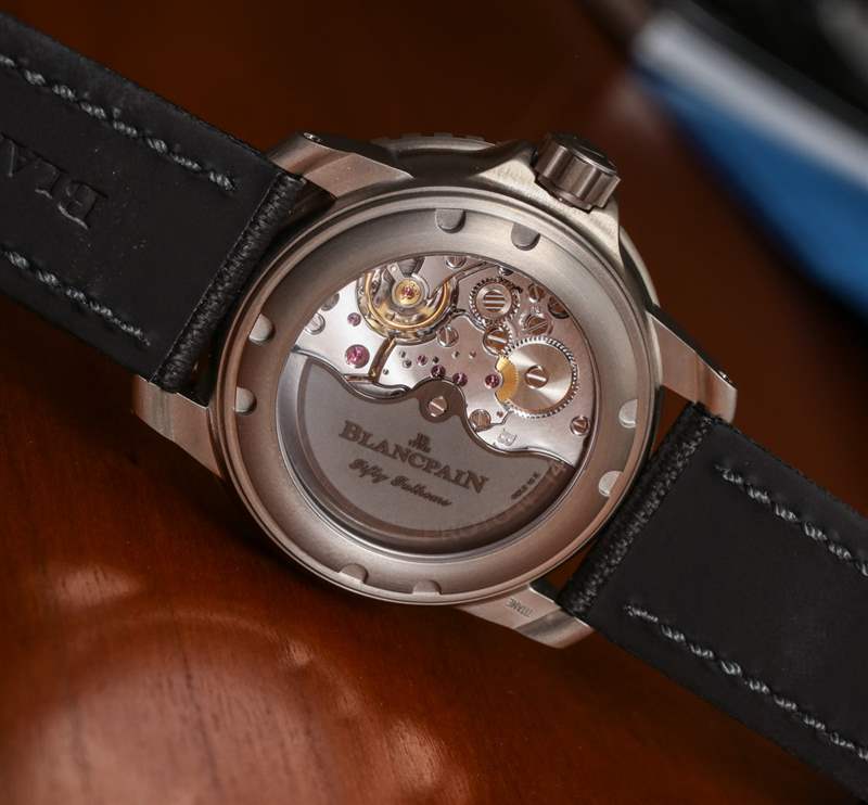 我非常欣賞這種機(jī)械機(jī)芯,我們現(xiàn)在可以通過這款五十噚型號的底蓋查看它。然而,我很遺憾寶珀使用了更通用的寶珀品牌轉(zhuǎn)子設(shè)計(jì),而不是更貼近潛水表的主題。以前的型號有一個形狀像鸚鵡螺殼的自動轉(zhuǎn)子。在我看來,這樣的事情會讓收藏家與這只手表形成更緊密的情感紐帶。最后,我想補(bǔ)充一點(diǎn),因?yàn)楣栌谓z,5050(和5015一樣)是一款“防磁”手表,具有良好的抗磁場水平。